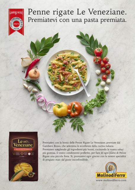 Due le uscite previste per la campagna della pasta al mais “Le Veneziane” con due ricette differenti, una a base di pomodorini e mozzarelline e l’altra con piselli e bacon.